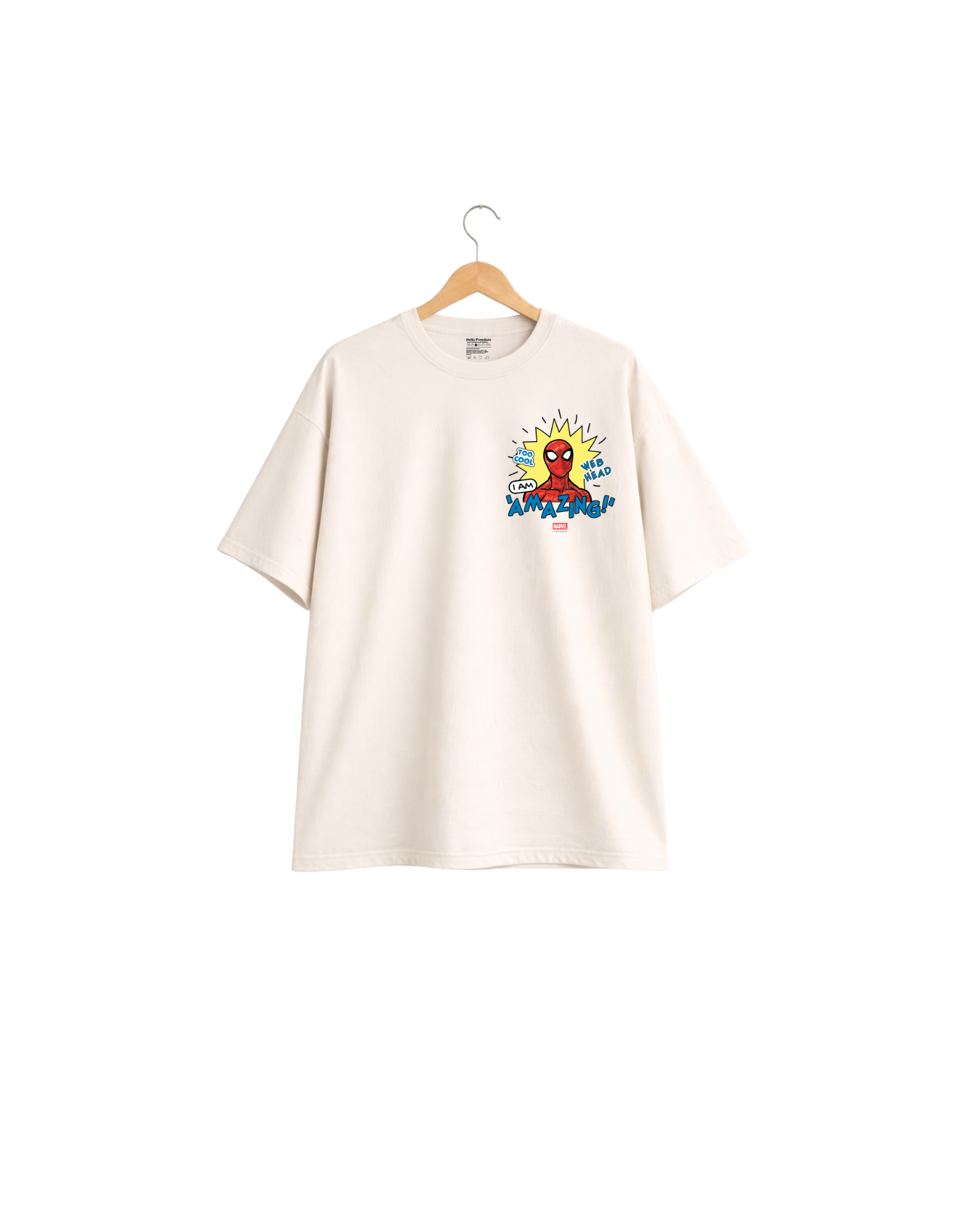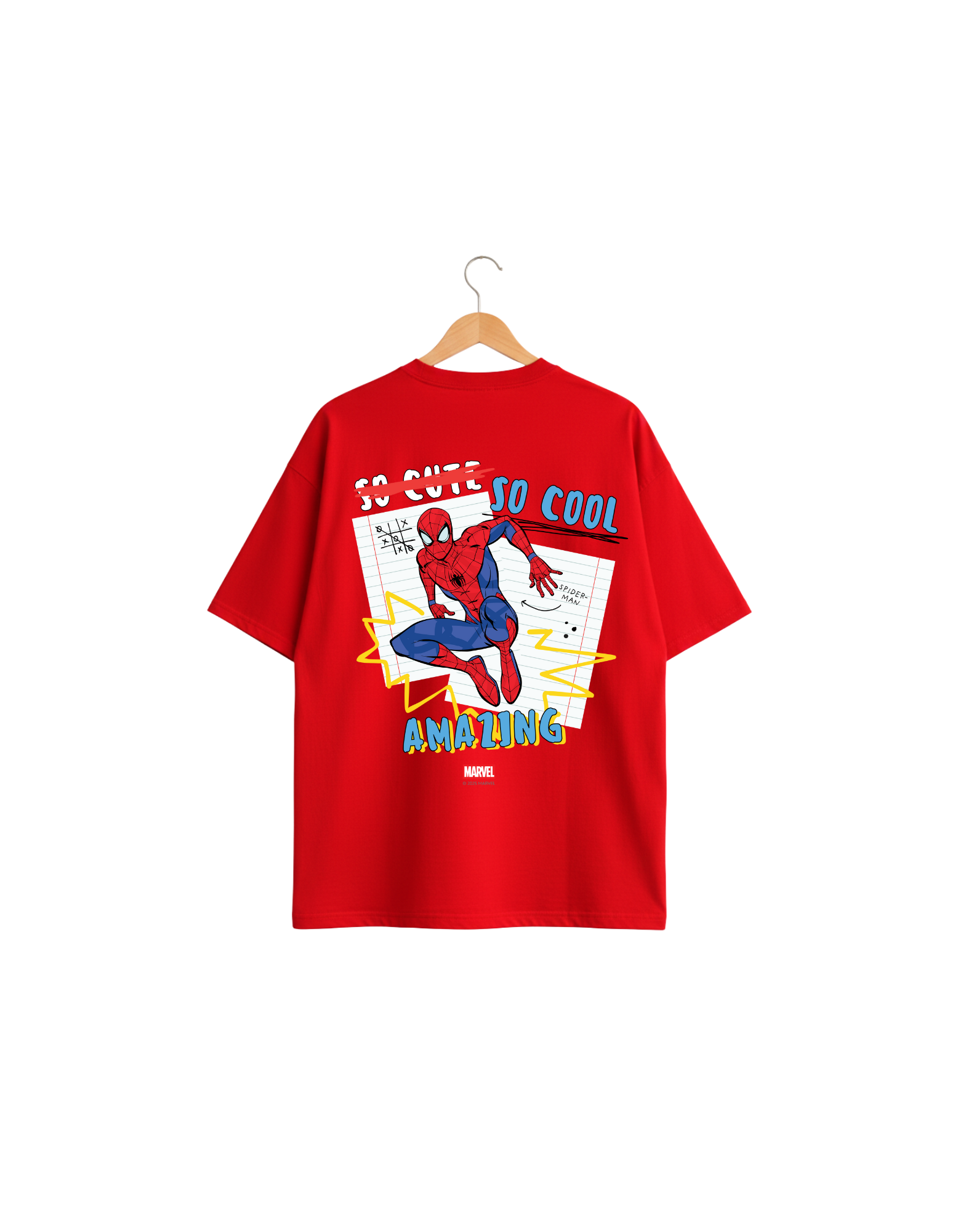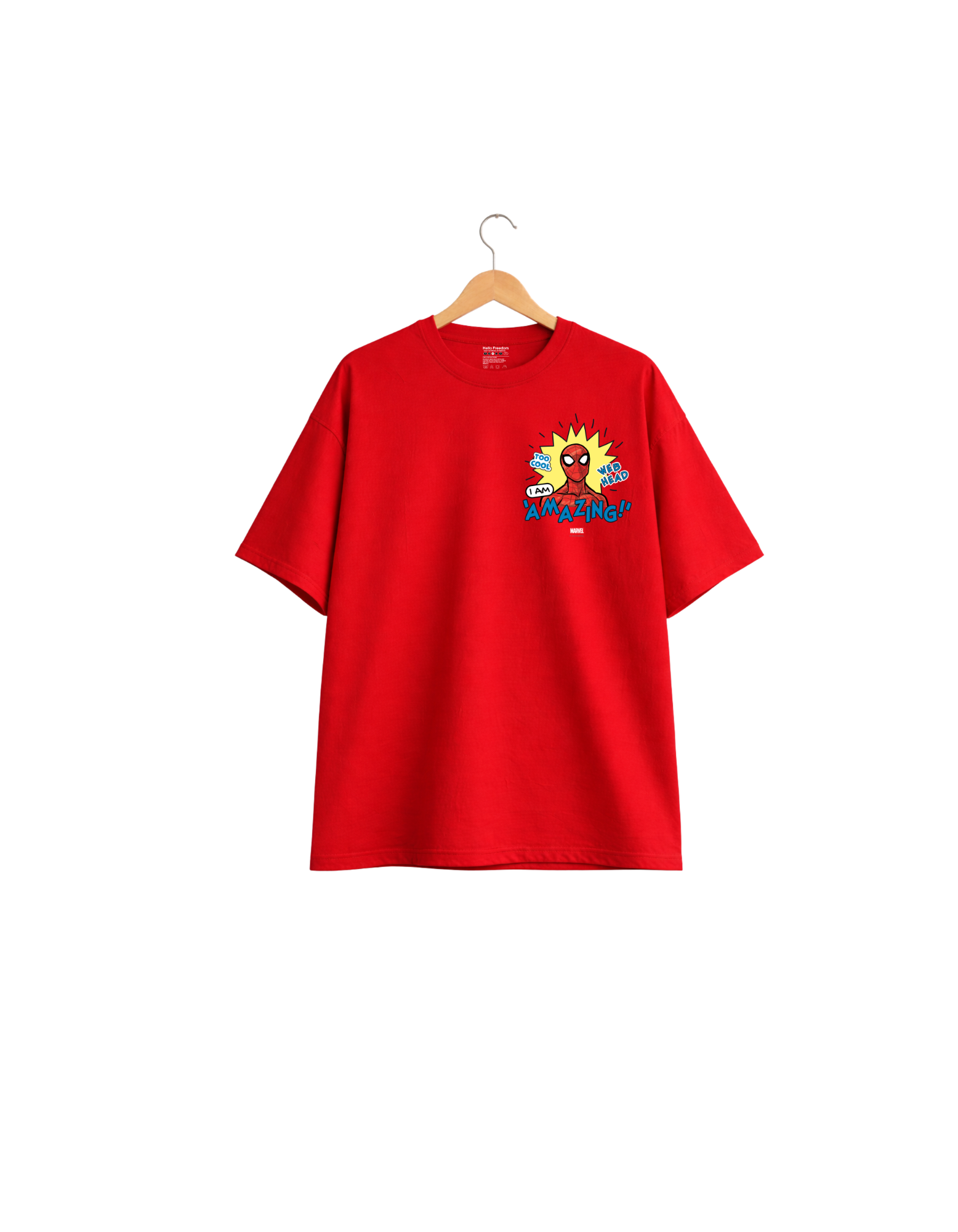 Bright red kids T-shirt featuring a fun graphic of Spider-Man with playful comic-style text. Made from soft, comfortable fabric—perfect for everyday wear, playtime, or superhero fans.