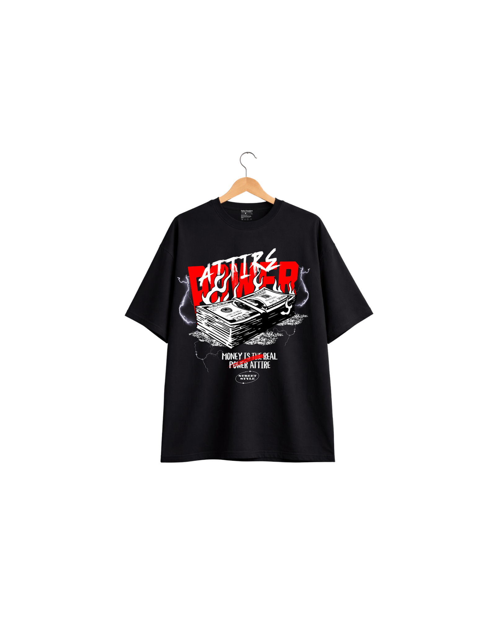 Make a bold statement with this oversized graphic tee featuring a powerful money-inspired print and striking flame details. Designed in a relaxed fit for maximum comfort, it blends high-energy street style with confident attitude. Pair it with cargos, denim, or sneakers for a standout look that speaks power and ambition.